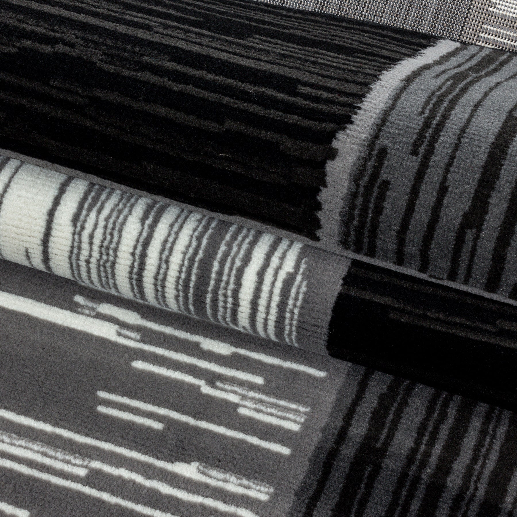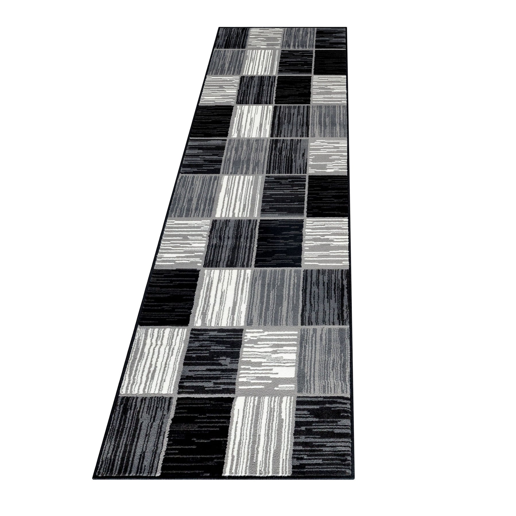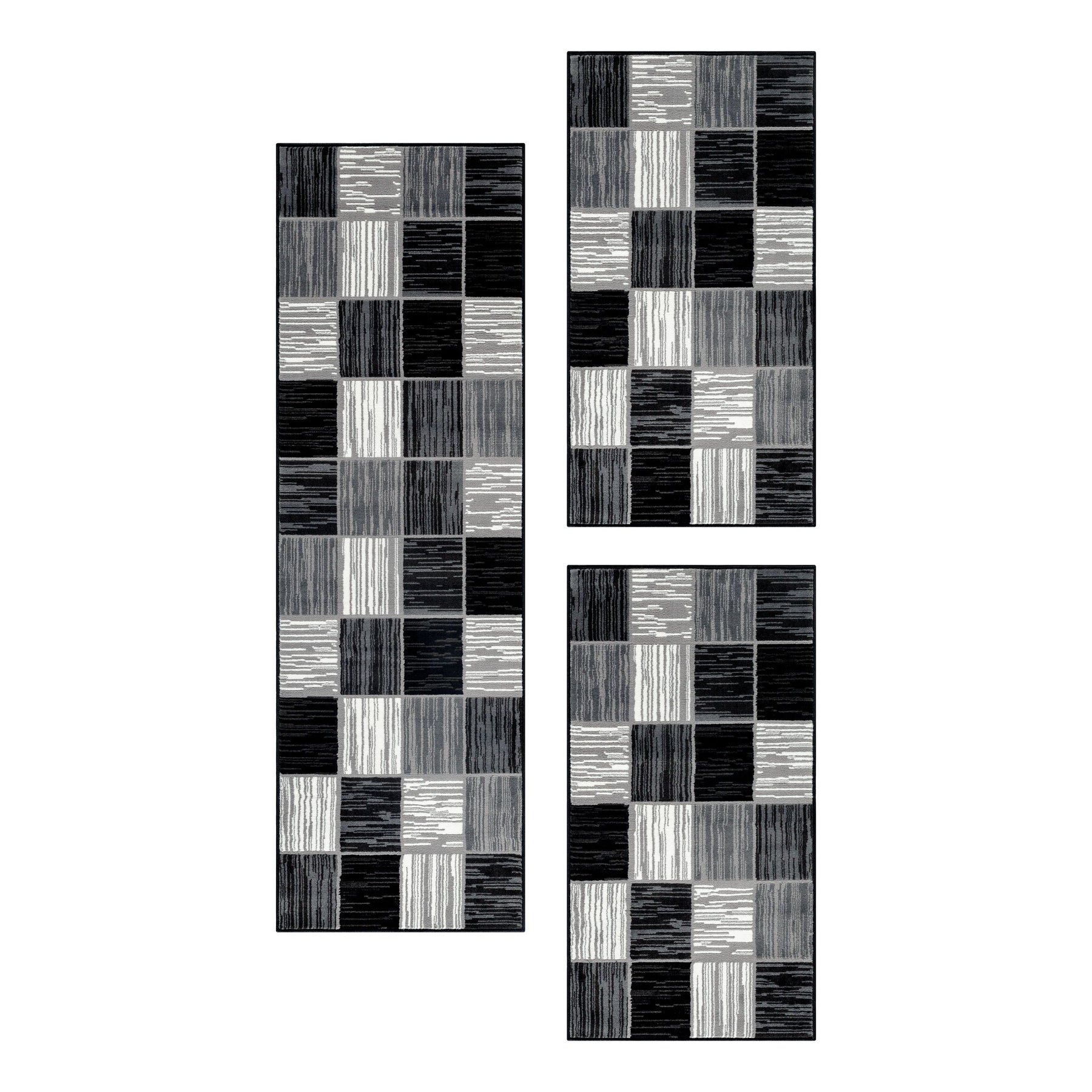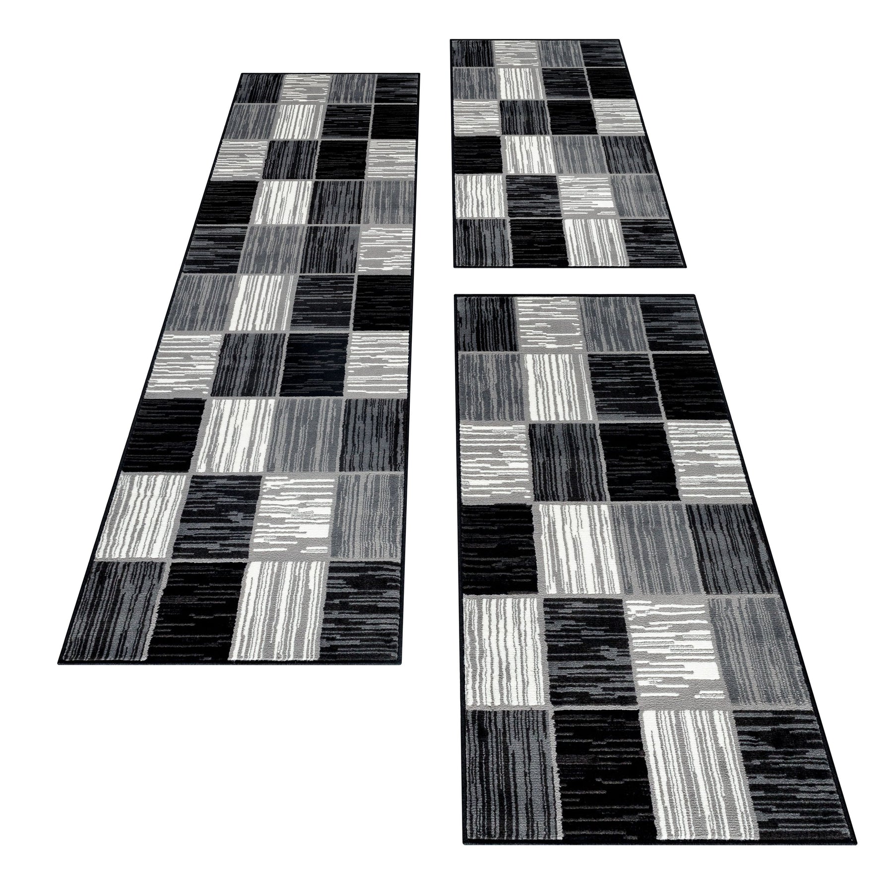 Teppich Läufer Set Schlafzimmer Kurzflor Weich Bettumrandung Schwarz Karo Design